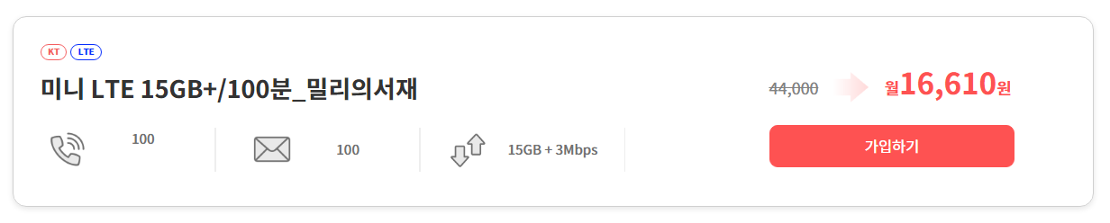 밀리의서재까지 포함된 미니게이트 15GB 요금제 입니다.