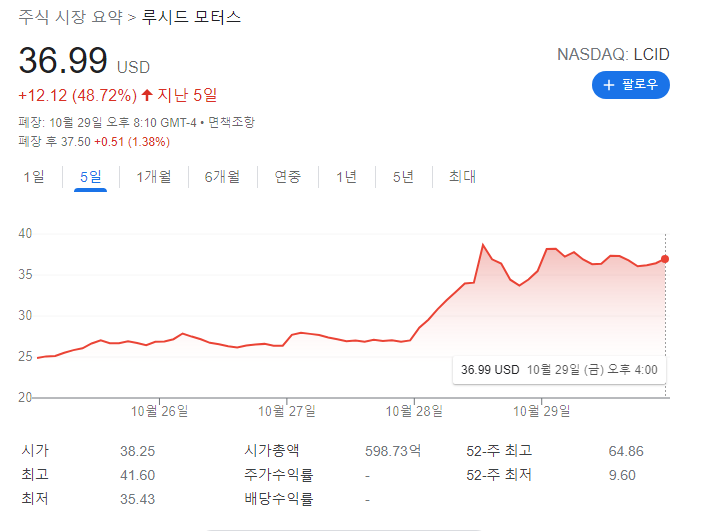루시드 홀더 분들께 축하드릴만한 소식입니다. 루시드 그룹이 최근 2 일간 급반등하면서 (심지어 장중 47% 까지 상승) 엄청난 상승을 기록했는데 서학개미들이 테슬라 다음으로 전기차 관련 많이 매집하던 종목으로 알려져 있던 루시드가 마침내 이렇게 기대를 충족시켜 주는 것 같습니다.