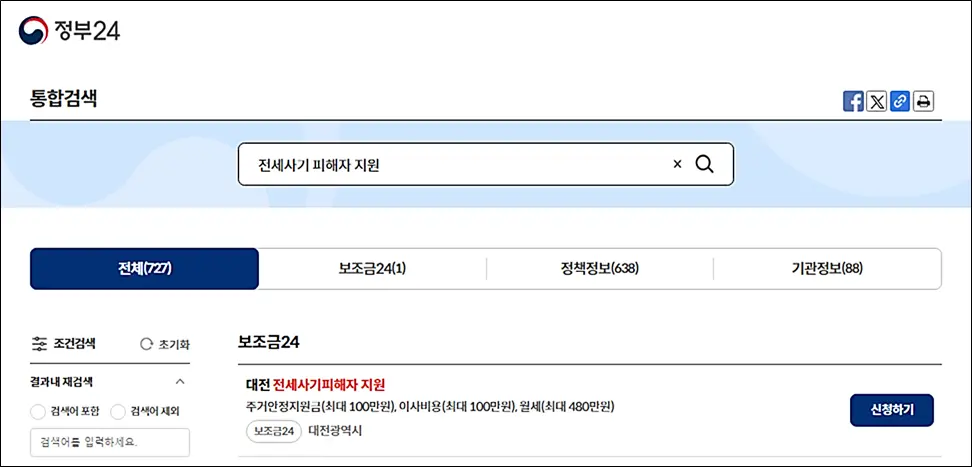 온라인 신청은 정부 24 접속 후 검색창에 대전 전세사기 피해자 지원 검색하여 신청하실 수 있습니다.