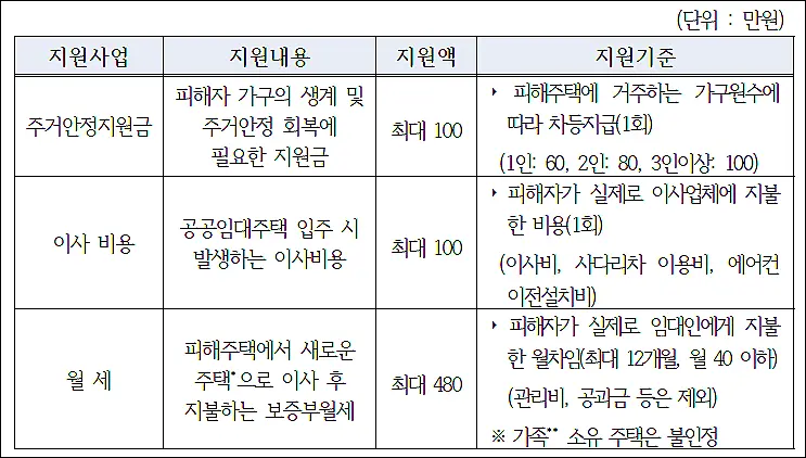 최대 100만원 | 피해자 가구 생계지원 주거안정회복 목적 피해주택 거주 가구원수에 따른 차등지급 1인 60 2인 80 3인 이상 100 만원 지원센터에서 안내하는 신청 시기에 신청 접수 진행 |
