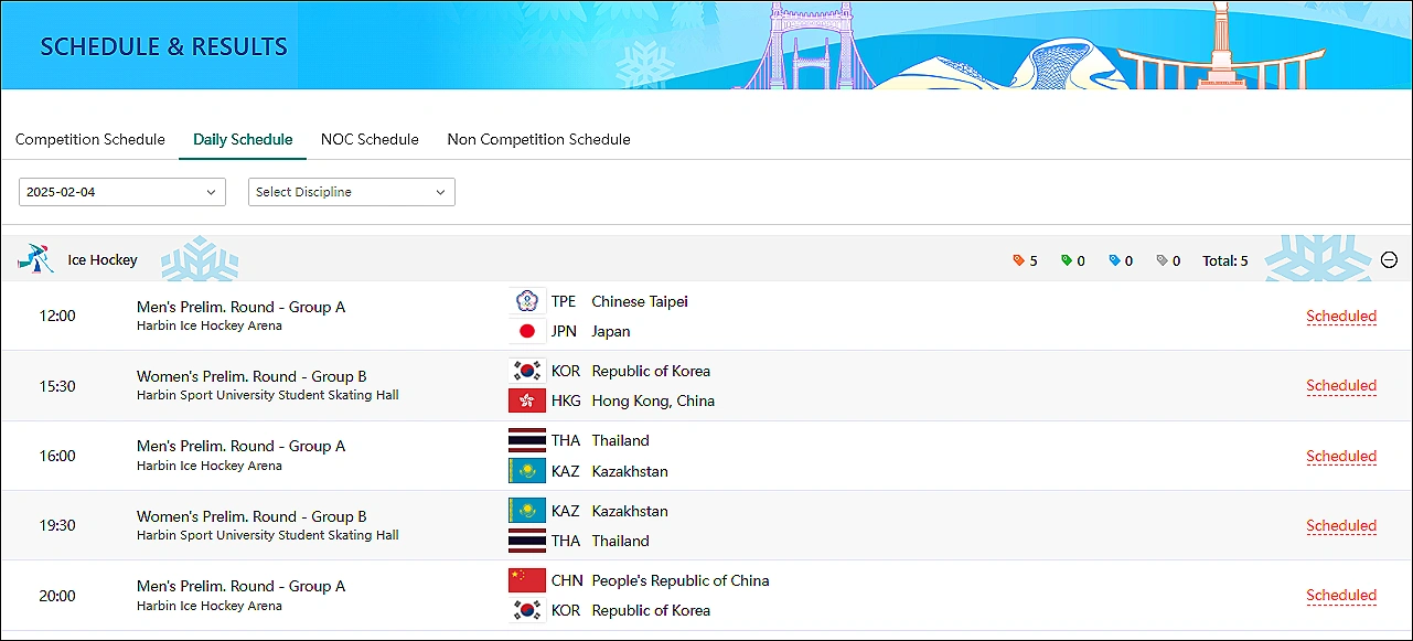- 개/폐회식 장소: 하얼빈 국제 컨벤션 전시 체육 센터