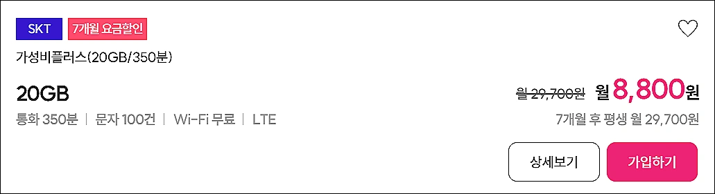 - 티플러스 가성비플러스 (20GB/350분/LTE) 월 8,800원 (7개월)