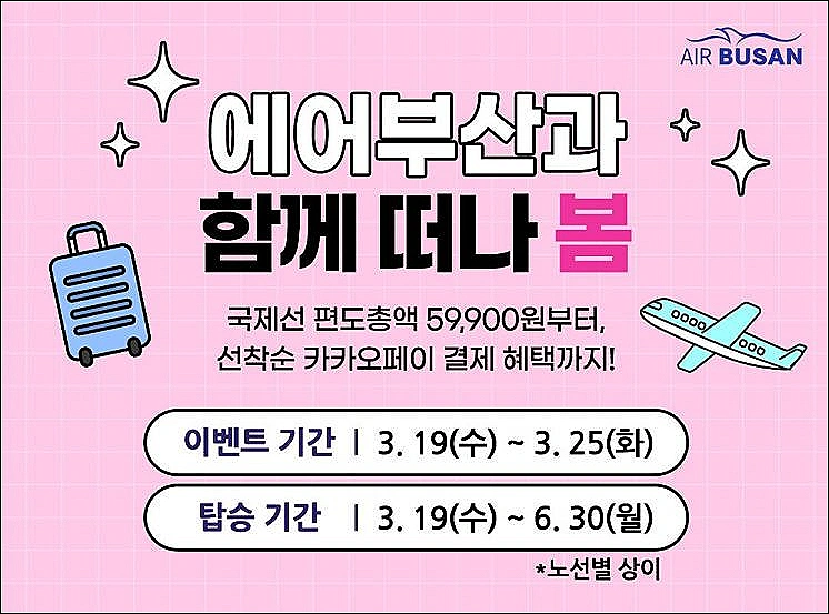 다가오는 봄, 여행 계획 중이신가요? ✈️ 에어부산이 최대 95% 할인된 국제선 특가 항공권은 물론 국내선 얼리버드 항공권 특가를 내놓으면서 해외여행과 국내여행을 한 번에 준비할 수 있는 절호의 기회가 찾아왔습니다.