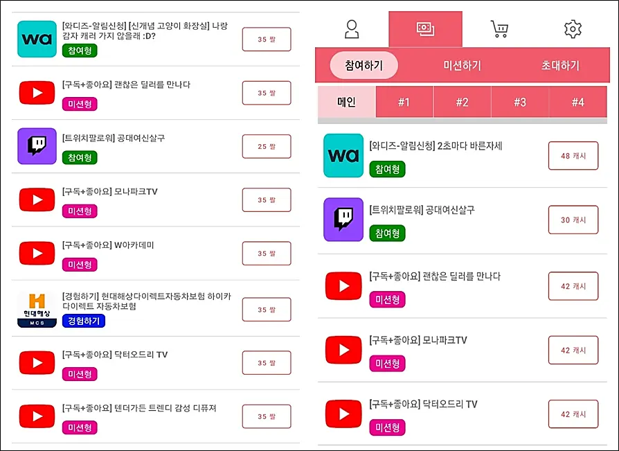 캐시몽의 참여하기가 쉬워서 미션하기는 잘 안쳐다 보게 될수도 있는데 사실 진짜 고단가 광고는 미션하기에 집중되어 있습니다.