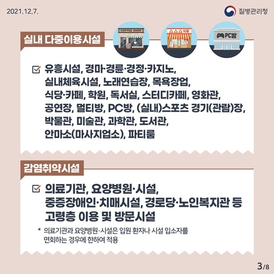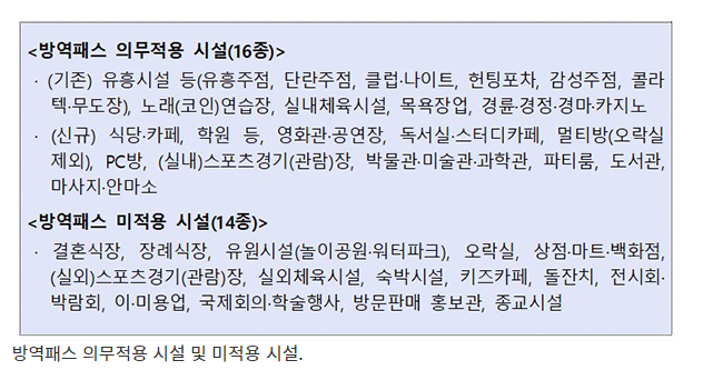 | 실내 다중 시설 | 방역 패스 의무 적용 시설 5 종 | 방역 패스 의무 적용 시설 16 종 확대 |