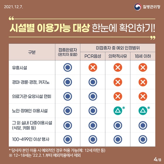 | 청소년 방역 패스 | 청소년 18 세 이하 방역패스 예외 | 11 세 이하 방역패스 예외 (2월 1일부터 시행) |