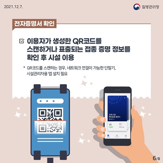 접종 완료시 COOV 앱 (COOV 앱과 연동된 전자 출입명부 플랫폼, 네이버, 카카오, 토스, 통신 3사 인증 PASS 앱) 에서 본인 인증 및 접종 정보를 업데이트 후 사용이 가능하며 고위험 다중 이용시설 또는 감염 취약시설 이용시 COOV 앱에서 QR코드 생성 및 스캔 후 입장하실 수 있습니다.