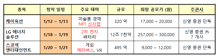 전반적인 일정을 보면 1월 초반의 오토앤, 케이옥션, 애드바이오텍 1차, 2차 LG 에너지 솔루션, 그리고 1월 중후반의 이지트로닉스와 스코넥 엔터테인먼트 3차, 1월 후반의 나래나노텍, 아셈스로 나뉘어진다고 할수 있을 것 같습니다.