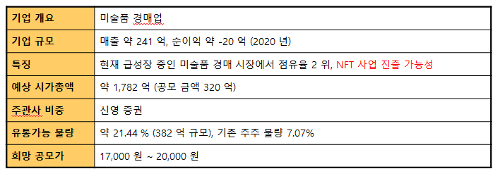 현재 LG 에너지 솔루션 다음으로 1 월 가장 많은 기대를 모으고 있는 공모주가 아닐까 싶습니다. 이미 경쟁 업체인 미술품 경매 업계 1 위 서울 옥션이 NFT 테마에 묻어가서 무려 4 배 이상 떡상했기 때문인데요. 미술품 경매 시장은 현재 급성장하는 신규 재테크 시장으로 거기에 NFT 까지 주식 시장에서 매우 좋아하는 테마를 갖추고 있습니다. 2022 년은 NFT 시장이 폭발하는 한해가 될 것이라는 예상이 많기 때문에 향후 전망도 매우 좋게 평가 받고 있습니다.