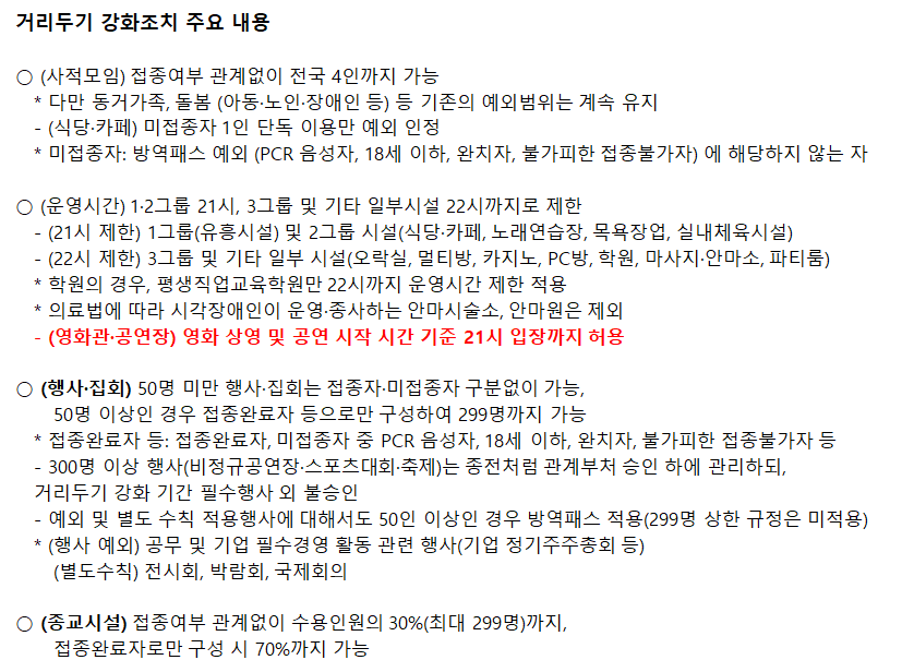 많은 분들께서 예상은 하셨겠지만 현행 사회적 거리두기가 2 주 더 연장되어 1월 16일까지 시행될 예정입니다. 거의 대부분 현행대로 유지되지만 영화관 등 일부 시설에 대해서는 일부 조정이 있었는데요. 영화관, 공연장의 경우 기존 22 시 운영 제한에서 상영·공연 시작 시간을 기준으로 21시까지 입장할 수 있도록 조정했습니다. 다만 영화나 공연이 종료되는 시간이 밤 12시를 넘겨서는 안된다고 하네요. 일부 달라진 부분을 포함한 주요 내용은 하기와 같습니다.