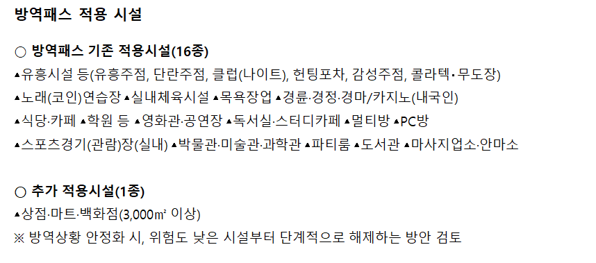 방역패스도 조정이 있었습니다. 바로 백화점, 대형 마트 등의 대규모 점포에도 기존과 달리 방역패스 적용이 추가된다는 것인데요. 그동안은 백화점, 대형마트 등은 출입관리가 사실 어려워서 방역패스 적용이 제외되었으나 이번에 드디어 추가가 되었습니다.