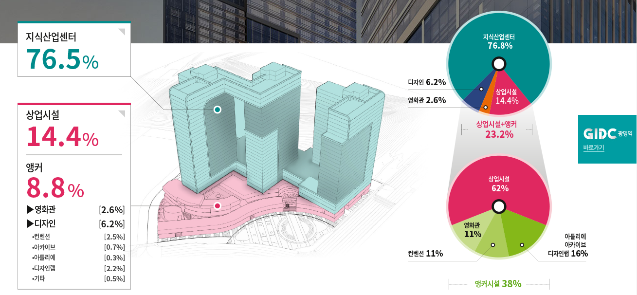디자인 도시 광명의 정체성을 나타내 주는 복합 단지인 GIDC 는 디자인에 특화된 지식산업센터 (아파트형 공장) 로 GIDC 에 소속된 스트리트몰이 바로 GIDC Mall 입니다.