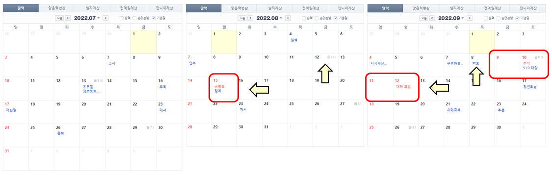 7 월은 예전 제헌절이 그리워 지는 달입니다. 다만 대부분 7 ~ 8 월에는 여름휴가가 있기 때문에 아마 많은 분들께서 여름 휴가를 기준으로 연차를 붙여 쓰시지 않을까 생각됩니다. 8 월은 15 일 광복절이 월요일입니다.