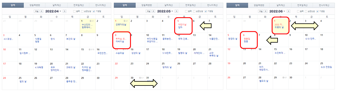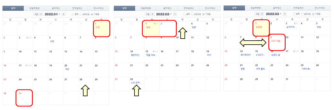 상기 화살표가 연차 포인트인데요. 1 월의 경우에는 28 일 금요일 또는 2월 3일 목요일 2 일 연속 앞 뒤로 연차를 내실 수 있다면 (과연?) 구정 연휴를 포함하여 최대 7 일까지 연휴가 가능합니다. 하지만 제일 좋은 시나리오는 2 월 28 일 금요일은 설 전날이라 선물 받고 일찍 퇴근하시고 2 월 3 일과 2 월 4 일 2 일 연속 연차를 쓰는 것입니다. 만일 그렇게 되면 2022 년 최대 9 일 연휴가 가능합니다. 물론 회사 분위기에 따라 쉽지는 않을 수 있긴 합니다. 그리고 2 월에는 한동안 휴가가 없다가 3 월 1 일 삼일절이 화요일입니다. 따라서 2 월 28 일 월요일 연차를 낸다면 2 월 26 일부터 3 월 1 일까지 4 일 연휴가 가능합니다. 구지 더 첨부하지는 않았지만 2 월 28 일과 3 월 2 일 2 일을 연차를 낼수 있다면 5 일 연휴가 가능합니다. 또한 3 월 9 일 수요일이 대통령 선거일 입니다. 3 월 6 일과 3 월 9 일 사이에도 연차가 가능하시다면 역시 5 일 연휴가 가능합니다만 아마 대통령 선거일을 끼고 연차를 내시기에는 쉽지는 않을 것 같긴 합니다.