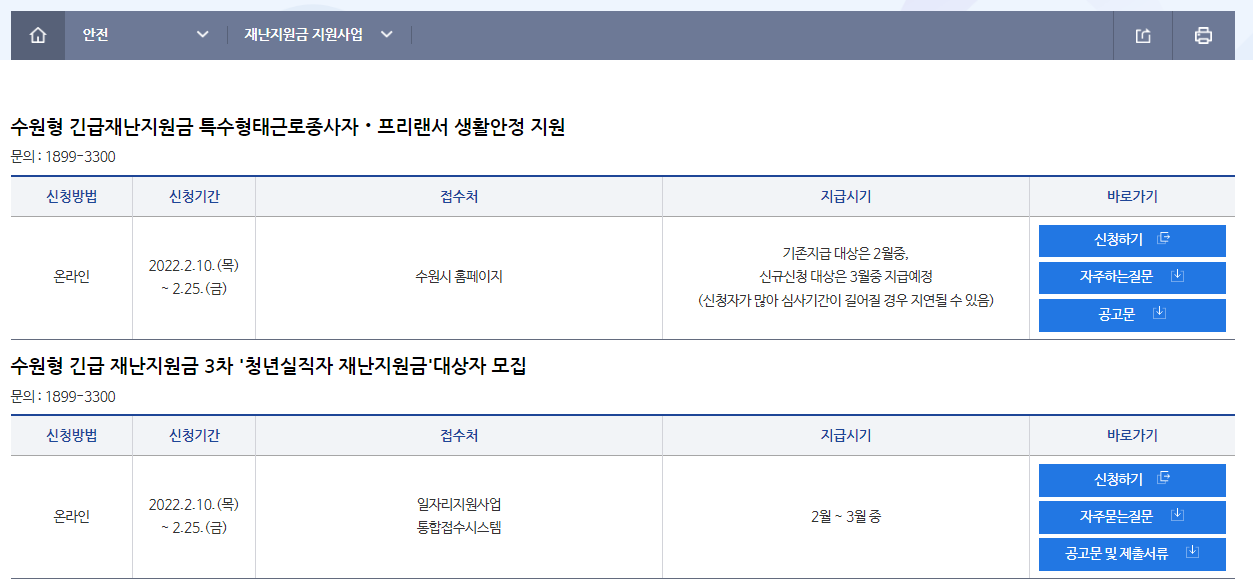 수원시청 홈페이지에서 특고, 프리랜서, 청년 실직자 긴급 재난지원금은 따로 상세 페이지가 만들어져 있어 자세한 지원 내역을 확인하실 수 있습니다.