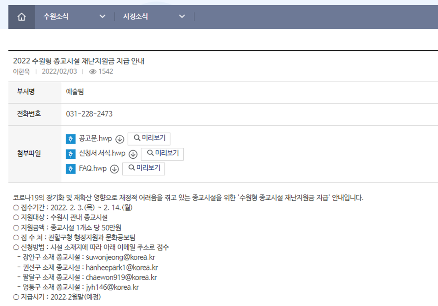 시정소식 16546 2 월 3 일자 수원형 종교시설 재난지원금 안내