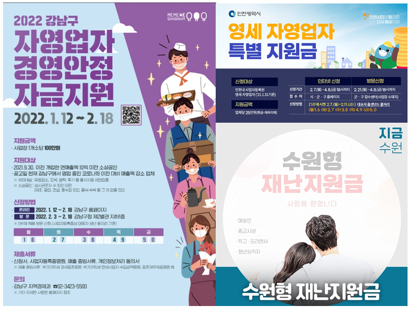 현재 서울 강남구에서 경영안정자금으로 100 만원, 인천에서는 자영업자 특별지원금 25 만원 경기도 수원시에서는 수원형 재난지원금 50 만원을 긴급 지원하고 있습니다. 지자체들 별로 틈새 지원금이 지속 발표되고 있는데요. 지자체 별도 지원인 만큼 정부 지원금과 별도 지급됩니다. 빠르게 알아보시고 신청하시면 좋을 것 같습니다.