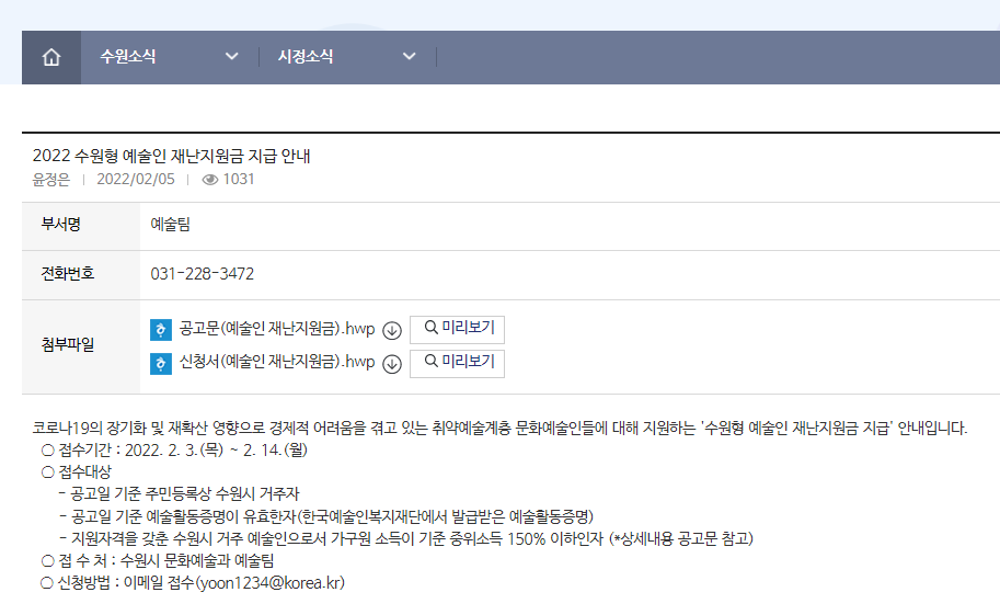 시정소식 16558 2 월 5 일자 수원형 예술인 재난지원금 안내