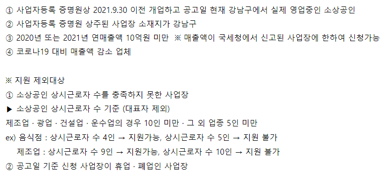 지원 대상은 하기와 같습니다. 사업장이 강남구이시면 대부분 되지만 주의하실 점은 소상공인 상시 근로자 수 기준이 있습니다. 이 부분에 맞아야 하기 때문에 이부분에 대해서는 확인을 하셔야 합니다.