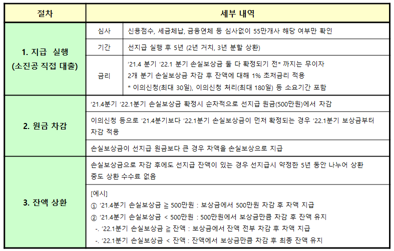 이미 신청까지 대부분 완료하셨을 것이기에 다 알고 계신 이야기 겠지만 한번 더 간략히 정리해보면 간단하게 손실보상 선지급 지원 방식은 지급실행 > 원금차감 > 잔액 실행의 단계로 진행이 됩니다.